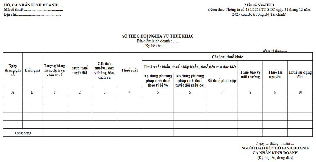 Nếu hộ kinh doanh có hoạt động liên quan đến thuế xuất khẩu, nhập khẩu, thuế tiêu thụ đặc biệt, thuế tài nguyên hay thuế bảo vệ môi trường, cần sử dụng thêm Sổ theo dõi nghĩa vụ thuế khác (Mẫu số S3a-HKD).
