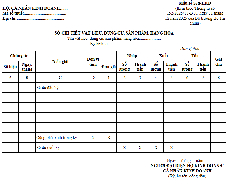 3. Sổ chi tiết vật liệu, dụng cụ, sản phẩm, hàng hóa (Mẫu số S2d-HKD):