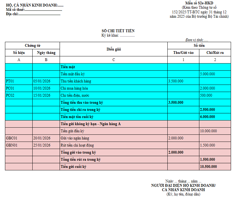 4. Sổ chi tiết tiền (Mẫu số S2e-HKD):