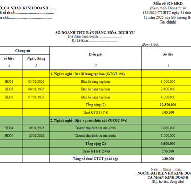 Hộ kinh doanh, cá nhân kinh doanh thuộc đối tượng không chịu thuế GTGT và không phải nộp thuế TNCN (nhóm có mức doanh thu dưới 500 triệu/năm) thực hiện ghi chép doanh thu bán hàng hóa, dịch vụ theo Sổ doanh thu (mẫu S1a-HKD).